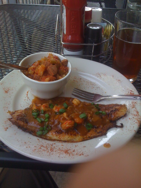 Bourbon Street Cafe is in what is known as “Bricktown,” and sits right on the riverwalk. In weather like this, how could I not sit outside in the breeze and watch the tour boats and ducks float by? I ordered the blackened catfish, with a side of jambalaya.