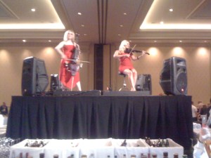 Dinner was great, but confusing. As was the case with all the meals, there were several buffet stations spread throughout the enormous ballroom. It’s truly the best way to feed over 6,000 people, after all. However, I noticed after I sat down with my fried rice that others at the table had fish of some sort. It turns out there were 3 or 4 different options, and therefore not all the buffet stations were the same. This made me wonder what foods I may have missed out on during the first two days. Oh well, no sense dwelling on it now. Besides, there was entertainment to enjoy. There were three platforms spread out in the central area of the ballroom, and on each one were two musicians playing electric violins, violas, and cellos.