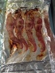 My eyes sprang open, and I flung off the covers. I couldn’t wait to try my diabolical (yet obvious) plan. I simply rub a light coating of olive oil on a sheet of aluminum foil. I liberally dust the strips of bacon with the maple spice, place them on the foil, and fold it flat. Baked at 400° for 20 minutes, and the result could not have been more perfect, nor more delicious! The apartment smelled so good, I nearly forgot to prepare my side dish: 3 fried eggs.